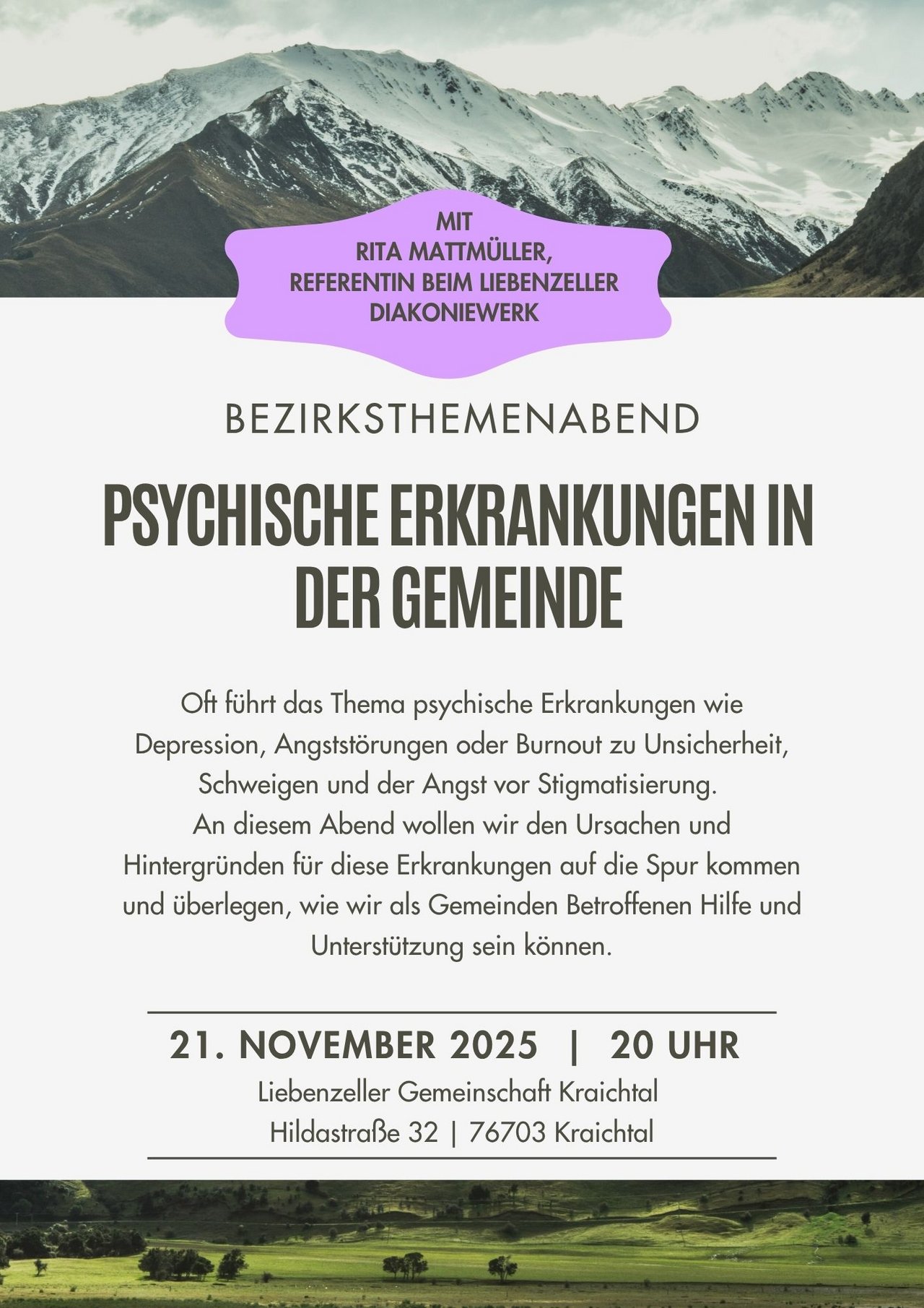 Am 21. November 2025 findet in Kraichtal (Unteröwisheim) der nächste Bezirksthemenabend statt. Die Referentin Rita Mattmüller (Liebenzeller Diakoniewerk) belichtet das Thema Psychische Erkrankungen aus der Sicht christlicher Gemeinden. Eine Anmeldung ist nicht erforderlich.