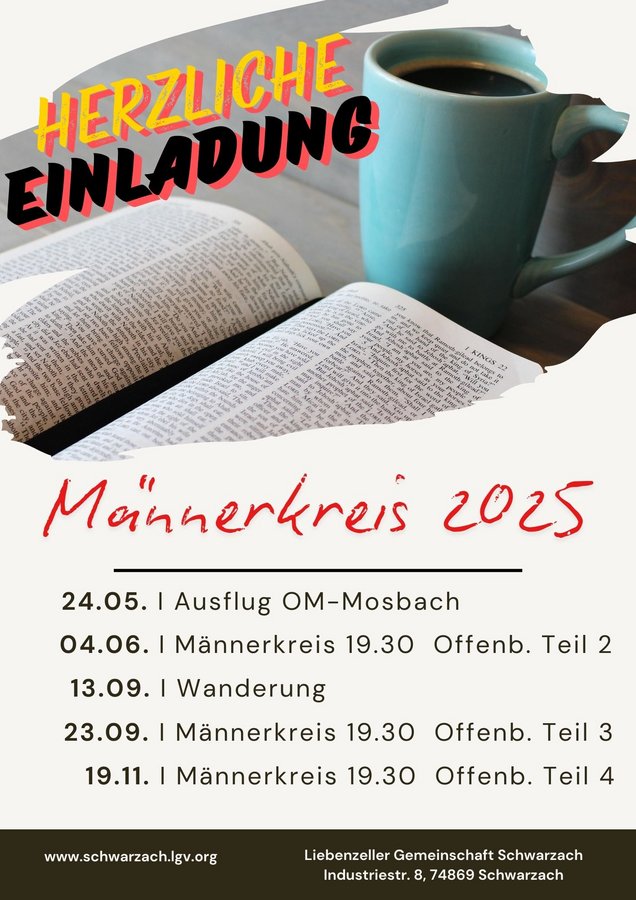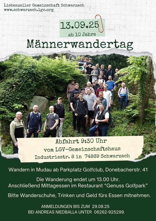 Am 13. September steht die nächste Wanderung des Männerkreises an. Anmeldungen dazu bitte an Andreas Niedballa (06262 925 299). Der Treffpunkt dazu ist das LGV-Gemeinschaftshaus um 9:30 Uhr. Die Wanderung endet im Restaurant "Genuss Golfpark" in Mudau. Alle Infos stehen in dem Flyer am Ende der Seite.